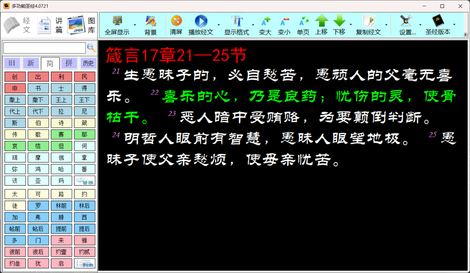 多功能圣经4.0721版 修复了4.072版本的BUG,如: 1)节号显示不完整; 2)双击方向键下移; 3)“Ctrl+<”向前增加经文出错,等问题。